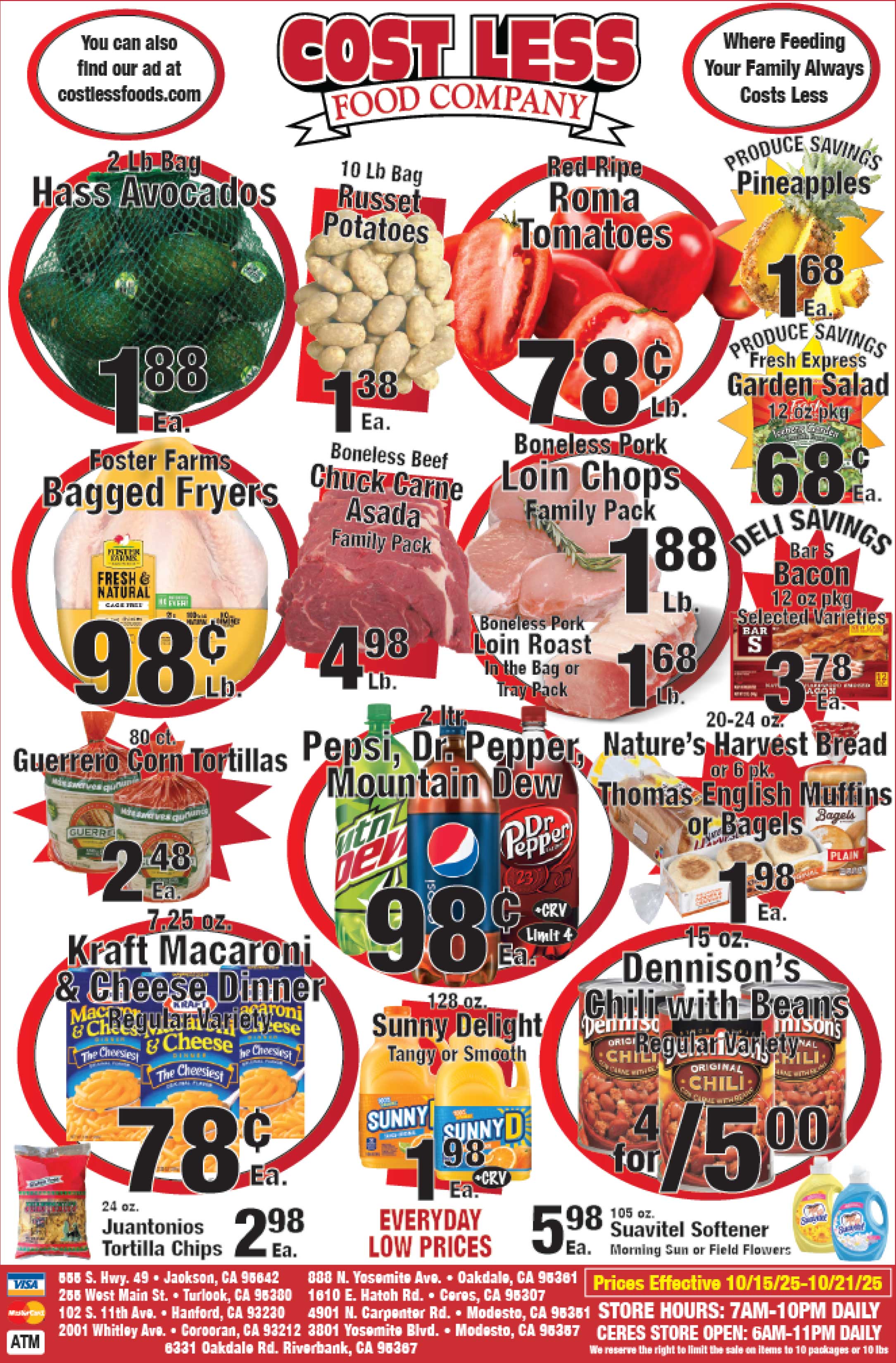 Weekly AdAt Cost Less Food Company, we provide low pricing on all of our grocery items, especially our amazing meat and fresh produce. We have no membership fees and there are no gimmicks, just everyday low food prices. We go above and beyond to help our shoppers. Unlike our competition, we will bag your groceries and even help you back to your car. We love the communities we serve and and strive to give back in as many ways as possible. We donate to local charities and food drives that continue to help the communities that we are located in. At Cost Less Food Company we understand who keeps us in business, and that is why we go above and beyond to make your shopping trip as easy as possible. Stop by one of our stores for great savings and even better food!
